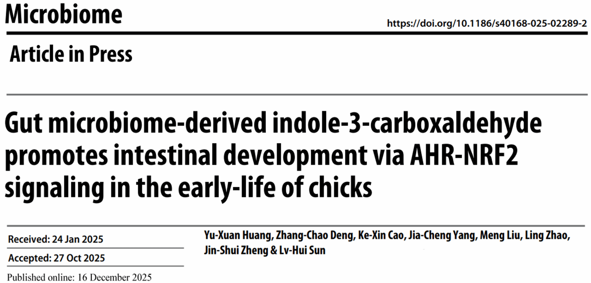 南湖新闻网讯(通讯员 黄宇轩)近日,我校农业微生物资源发掘与利用全国重点实验室、教育部动物育种与健康养殖前沿科学中心、湖北洪山实验室、动物科学技术学院动物医学院孙铝辉教授团队以“Gut microbiome-derived indole-3-carboxaldehyde promotes intestinal development via AHR-NRF2 signaling in the early-life of chicks”为题在Microbiome期刊上发表最新研究成果。该研究以肉雏鸡为研究对象,发掘出功能微生物菌株母鸡乳杆菌C2-16-2和唾液联合乳杆菌D7-21,并阐明其通过代谢色氨酸产生吲哚甲醛代谢物促进鸡肠道屏障功能和提高抗氧化能力的作用机制,在实施肠道菌群和代谢物干预改善肉雏鸡肠道健康方面具有重要意义。