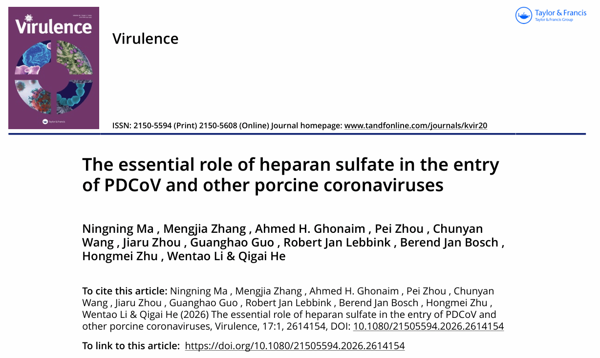 (通讯员:马宁宁、张梦佳)近日,我校动物科学技术学院、动物医学院李文涛教授与何启盖教授指导的博士研究生(已毕业)马宁宁及博士后张梦佳为共同第一作者,在《Virulence》杂志(中科院一区Top期刊)在线发表题为“The essential role of heparan sulfate in the entry of PDCoV and other porcine coronaviruses”的研究论文。该研究首次证实,硫酸乙酰肝素(HS)生物合成关键酶EXT1在PDCoV等多种猪肠道冠状病毒的入侵过程中发挥关键作用,为开发针对冠状病毒的广谱抗病毒策略提供了新的理论基础和潜在靶点。