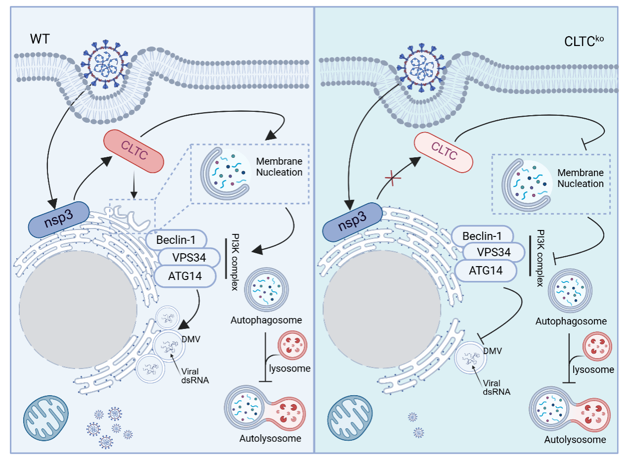 研究团队另辟蹊径,以动物冠状病毒为模型,将荧光蛋白精准标记在DMV关键构建病毒蛋白nsp3上,首次实现真实病毒感染下对DMV形成的实时可视化。利用这一新工具,团队成功鉴定出40个与DMV形成相关的宿主蛋白,其中网格蛋白重链(CLTC)被特异性富集于DMV组装位点,且对多种冠状病毒(包括人冠状病毒229E、PEDV、TGEV、MHV、PDCoV等)的复制至关重要。深入研究表明,病毒感染后,病毒蛋白nsp3可劫持CLTC,利用其在自噬成核阶段产生的自噬前体膜构建DMV。敲除CLTC可显著抑制自噬体成核及DMV形成,进而限制病毒复制。