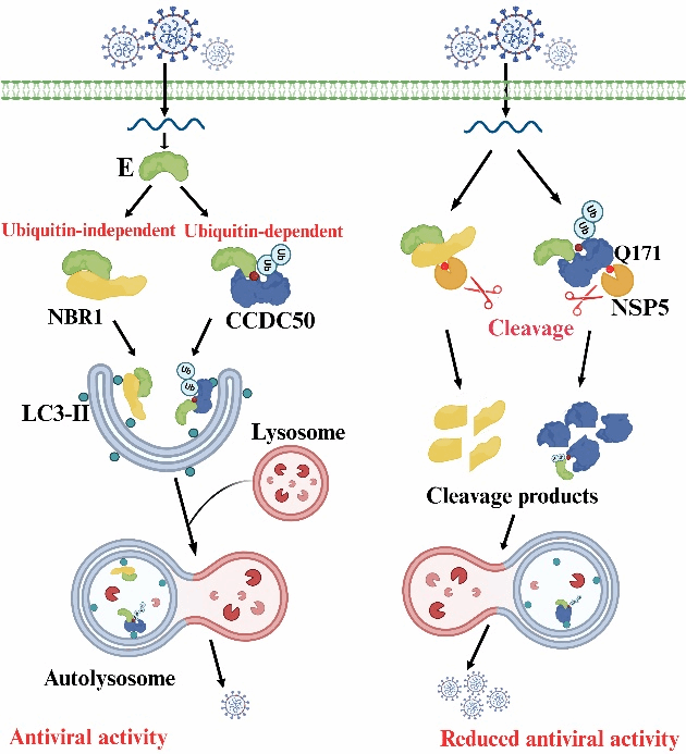 自噬是宿主抵御病毒感染的重要天然免疫防线,其中选择性自噬受体能够特异性识别病毒成分,并通过自噬-溶酶体途径介导其降解,从而限制病毒复制。该研究发现,CCDC50是一个新的抗病毒选择性自噬受体。在PDCoV感染过程中,CCDC50能够识别 K63泛素化修饰的病毒包膜蛋白E,并以不依赖经典自噬受体SQSTM1/p62和 NBR1的方式,介导其通过自噬-溶酶体途径降解,从而抑制病毒复制。进一步研究表明,PDCoV编码的蛋白酶NSP5可特异性切割CCDC50,破坏其介导的选择性自噬功能,帮助病毒逃逸宿主抗病毒反应。值得注意的是,SARS-CoV-2及其他冠状病毒的蛋白酶NSP5同样具备切割CCDC50的能力,提示通过切割宿主自噬受体来拮抗选择性自噬介导的抗病毒反应,可能是冠状病毒较为保守的免疫逃逸策略。