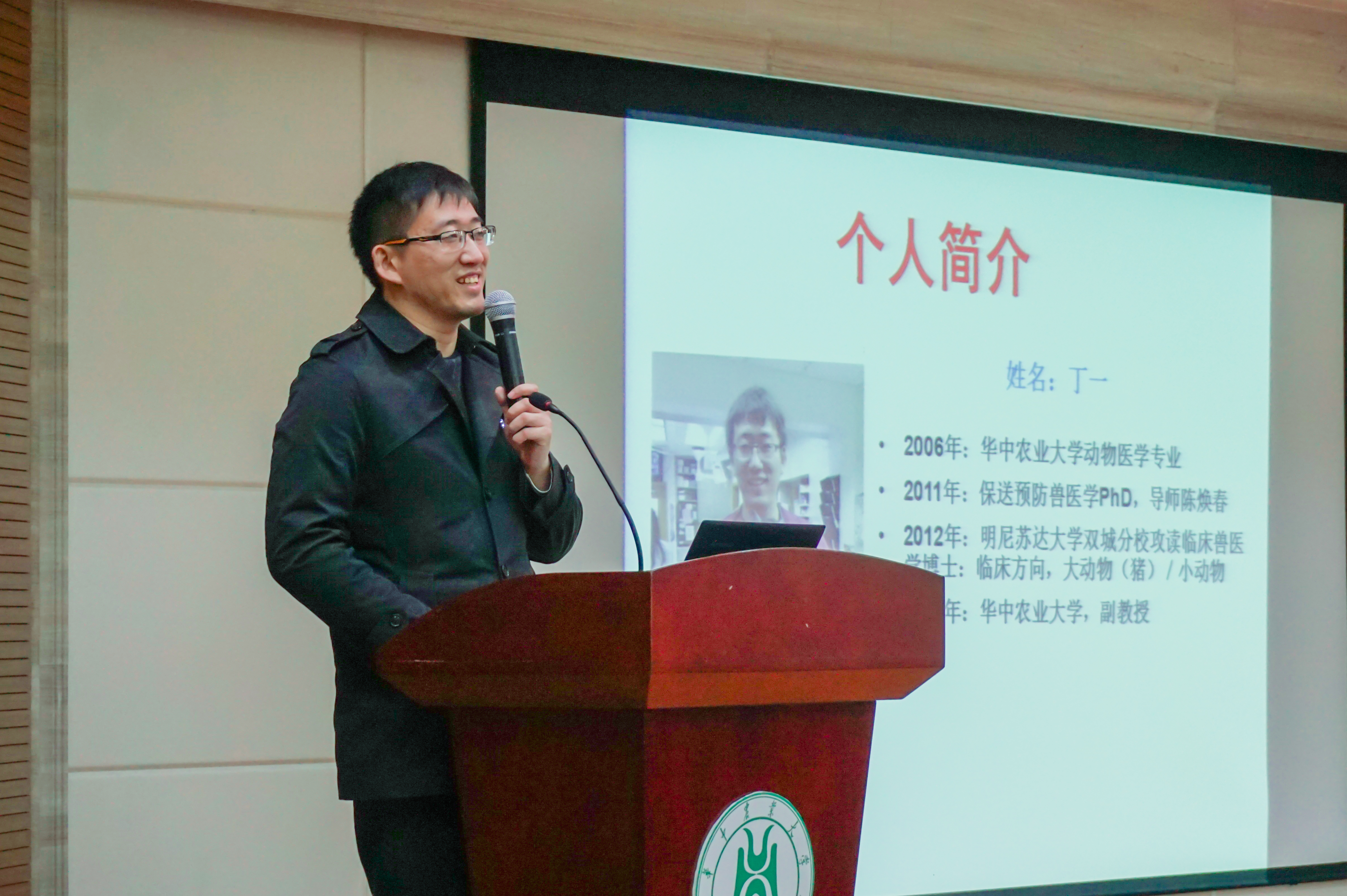 丁一针对中美合作职业兽医项目简介、国外DVM与国内兽医的比较两大方面进行宣讲。他表示DVM项目早在清朝时就为我国培养多位畜牧兽医专业人才,这也为我国兽医事业的早期发展打下坚实基础。当谈到中美兽医教育比较的时候丁一从学位制度、知识结构差异、临床实践、学习疾病的诊断过程四个方面并结合具体的案例展开论述。他表示国外临床研究的问题大多来源于临床实践,这是和我国很不一样的地方;此外他还指出,国内疾病诊断教学虽详细全面,但其从“疾病到症状”的教学方式却与临床“症状到疾病”的实际略有不符。在提问环节中,在座学生们针对自己不懂的问题踊跃发问,沈丁二人积极回答。