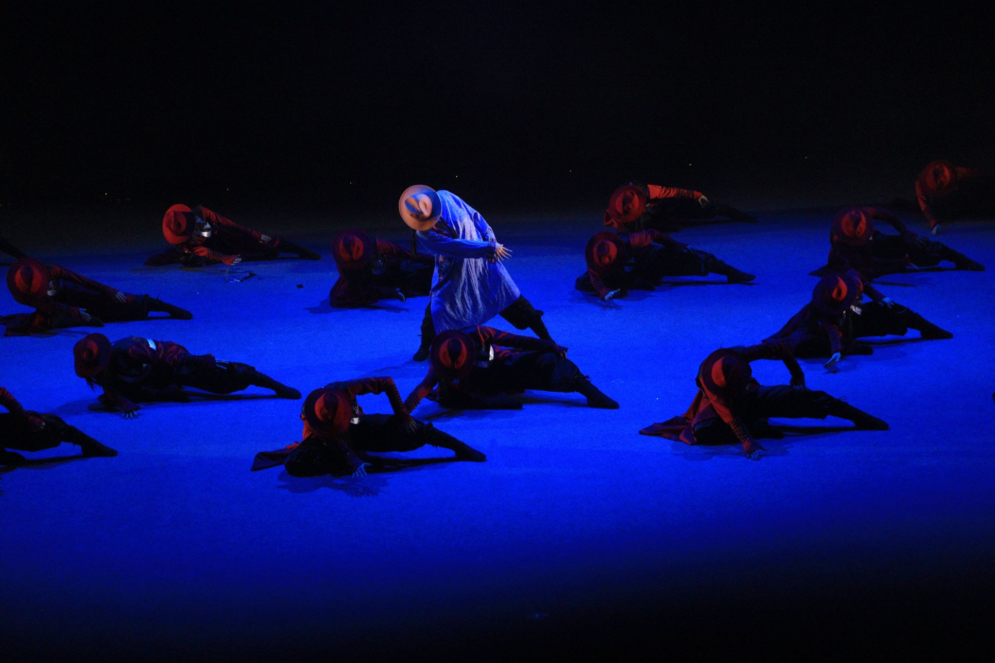 灯光下,银发老人双臂如苍鹰展翅般奋力舒展,身躯匍匐于大地,灵魂却奔向故土的光。群舞少女们昂首阔步,随热烈激昂的音乐将舞台化作沸腾的红色海洋。每一处肩部的抖动都带着穿透岁月的力量,每一次整齐划一的跺脚都似在叩击大地,诉说对生命的热爱与执着。当老人的身躯与年轻的幻影共舞,这不仅是与自我的和解,更是生命火种在岁月中的必然交替与永恒传承。演员们以此舞诠释:年华逝去,魂灵永存;生生不息,一如草原。