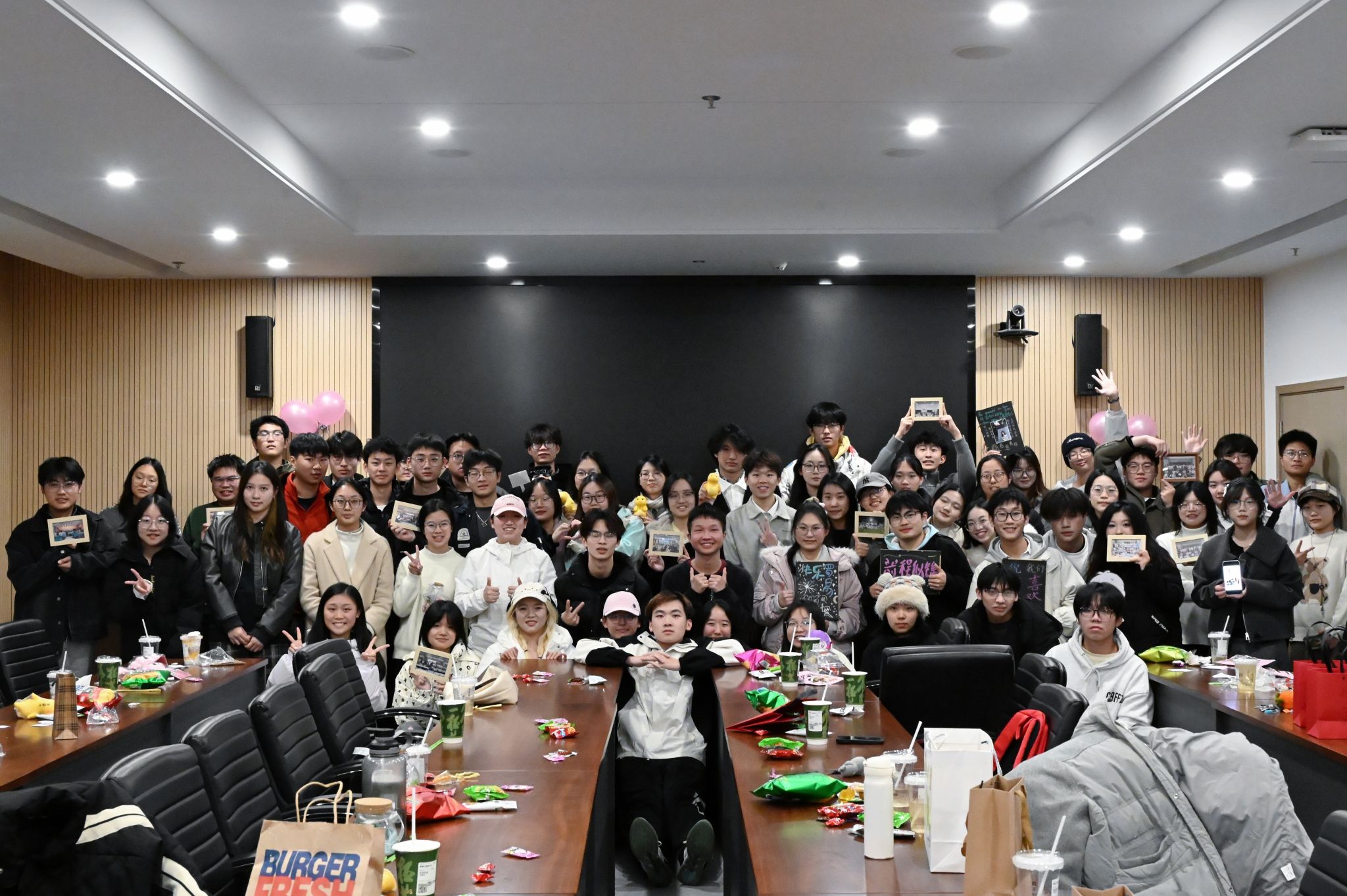 感恩致辞结束后,互动环节随即展开。主持人通过“谐音梗大挑战”游戏调动全场热情,下班组成员踊跃参与、积极应答;“合照拼图”挑战中,各班级下班组成员齐心合作、默契配合,完成拼图并解锁观看各班同学定制的“感恩视频”。互动尾声,各班代表向下班组成员赠送礼物,双方合影留念,定格温暖瞬间。
