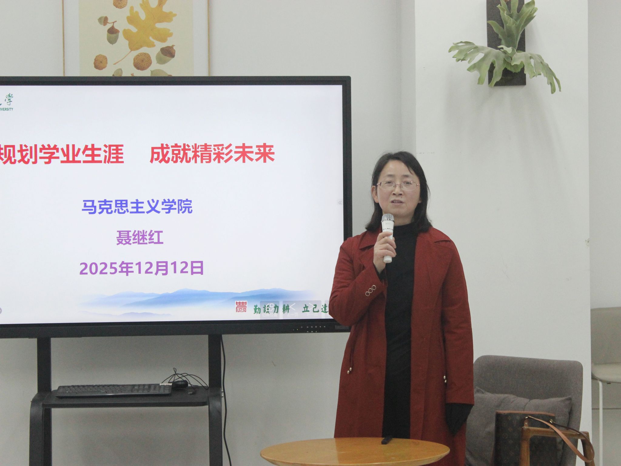 (通讯员:白晓星 摄影:梁舒雯)12月12日晚上,学院在学生综合服务楼103室举行“规划学业生涯,成就精彩未来”主题讲座,马克思主义学院聂继红老师受邀主讲,50余名本科生代表现场聆听参与互动交流。