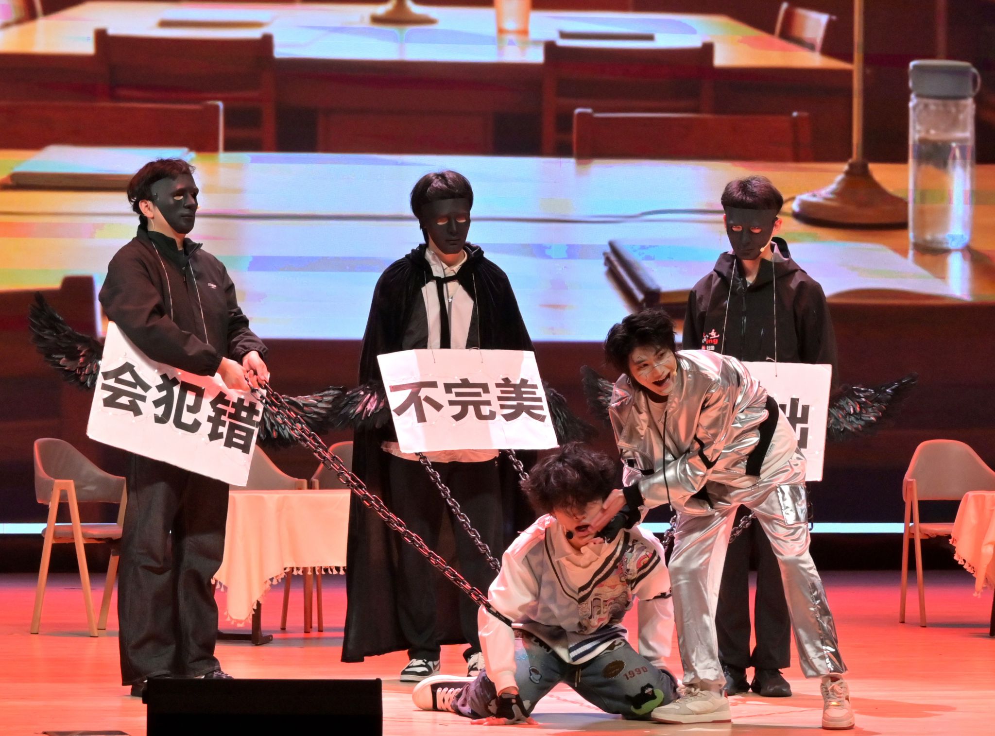在本届心理情景剧决赛的备战周期里,臻行剧社全体成员凝心聚力、全力以赴,逐字打磨剧本、反复推敲表演细节。舞台上的每一个场景都凝聚着团队成员的心血与汗水,各部门分工明确又紧密协作,针对情景剧节奏、舞台调度等方面开展多轮讨论与复盘,打磨表演效果,只为在决赛舞台上呈现完美作品。“结尾是剧本创作中改动最大的部分,一开始‘小美’和‘小己’没有讲多少台词,就草草袒露真心走到一起了,”臻行剧社负责人游嘉豪谈到,“但最终我们决定让这段故事拉长、对话增多,展现更多细节,还在结尾增加了轻松快乐的舞蹈来点明主题——做不完美的自己!”