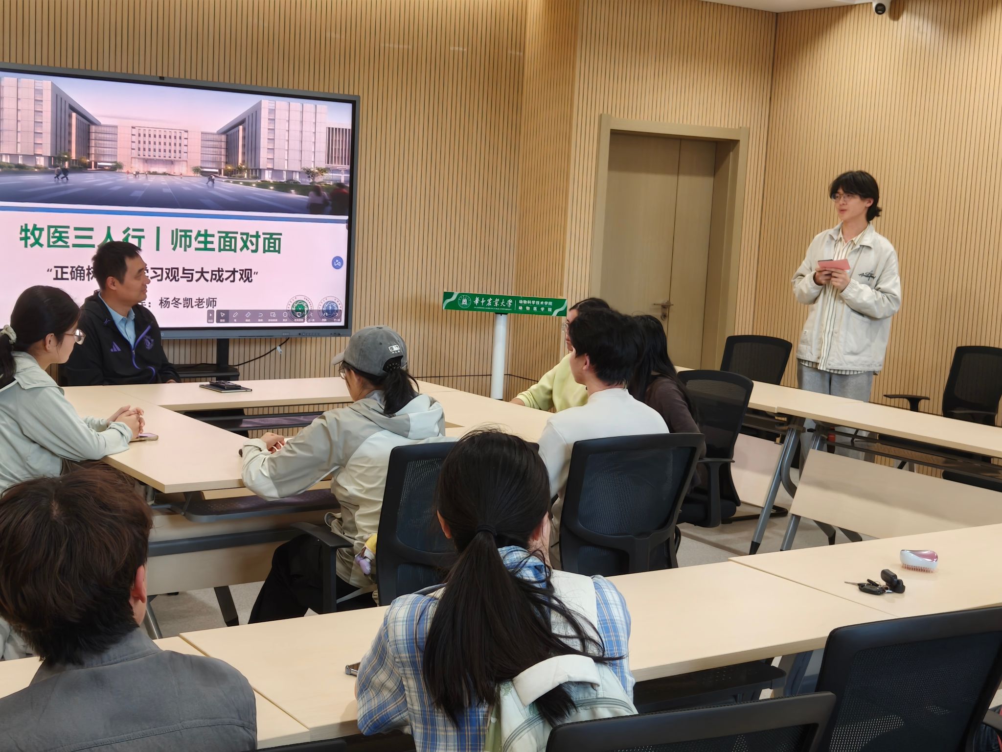 (通讯员:陈林溪 摄影:倪茁斌 陈林溪 姜纳川)4月17日下午,学院“牧医三人行”活动在第四综合楼F201会议室顺利举行。学院党委副书记杨冬凯围绕动物医学专业前沿动态与“大学习观”“大成才观”作分享交流,为牧医学子带来一场兼具专业深度与指导意义的精彩分享。活动由学院党建督察部学员王晨主持。