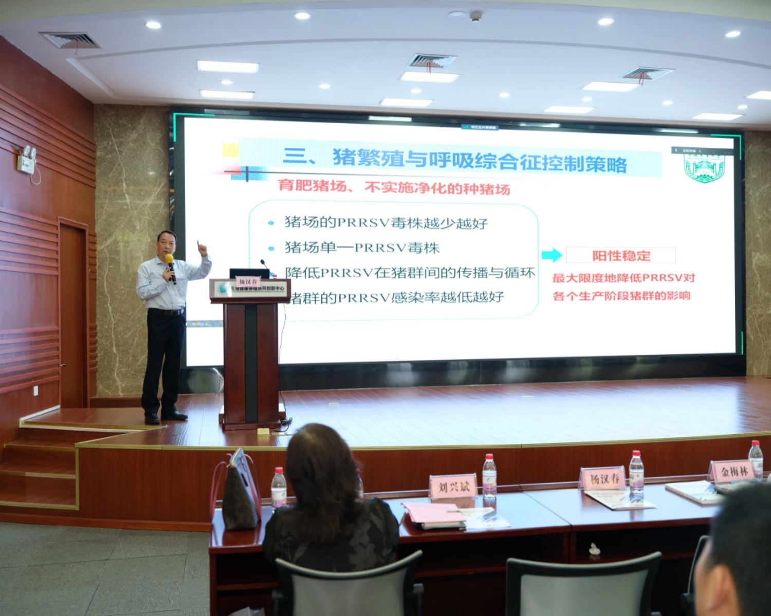 开幕式后,陈焕春、杨汉春、郑海学等人就当前猪病流行现状与防控对策,猪繁殖与呼吸综合征防控与净化策略,口蹄疫的流行、变异与防控净化等主题做学术报告。陈焕春在报告中全面梳理了当前我国规模化猪场主要疫病及病原的流行现状并提出了防控对策和建议,强调要建立完善的实验室诊断与临床兽医服务体系,扎实做好重大疫病的净化根除工作。杨汉春就当前我国猪繁殖与呼吸综合征的流行现状、综合防控策略和净化等方面作出报告。他指出,针对猪繁殖与呼吸综合征的防控应以生物安全防控为主,确有必要时应策略性地使用疫苗,有条件的企业要积极推动疾病的净化。郑海学在报告中分析了当前口蹄疫的国内外流行形势,同时比较了不同疫苗的保护性,指出做好口蹄疫的防控关键在于加强疫苗免疫。
