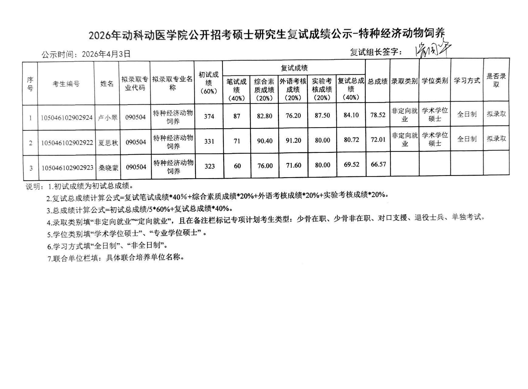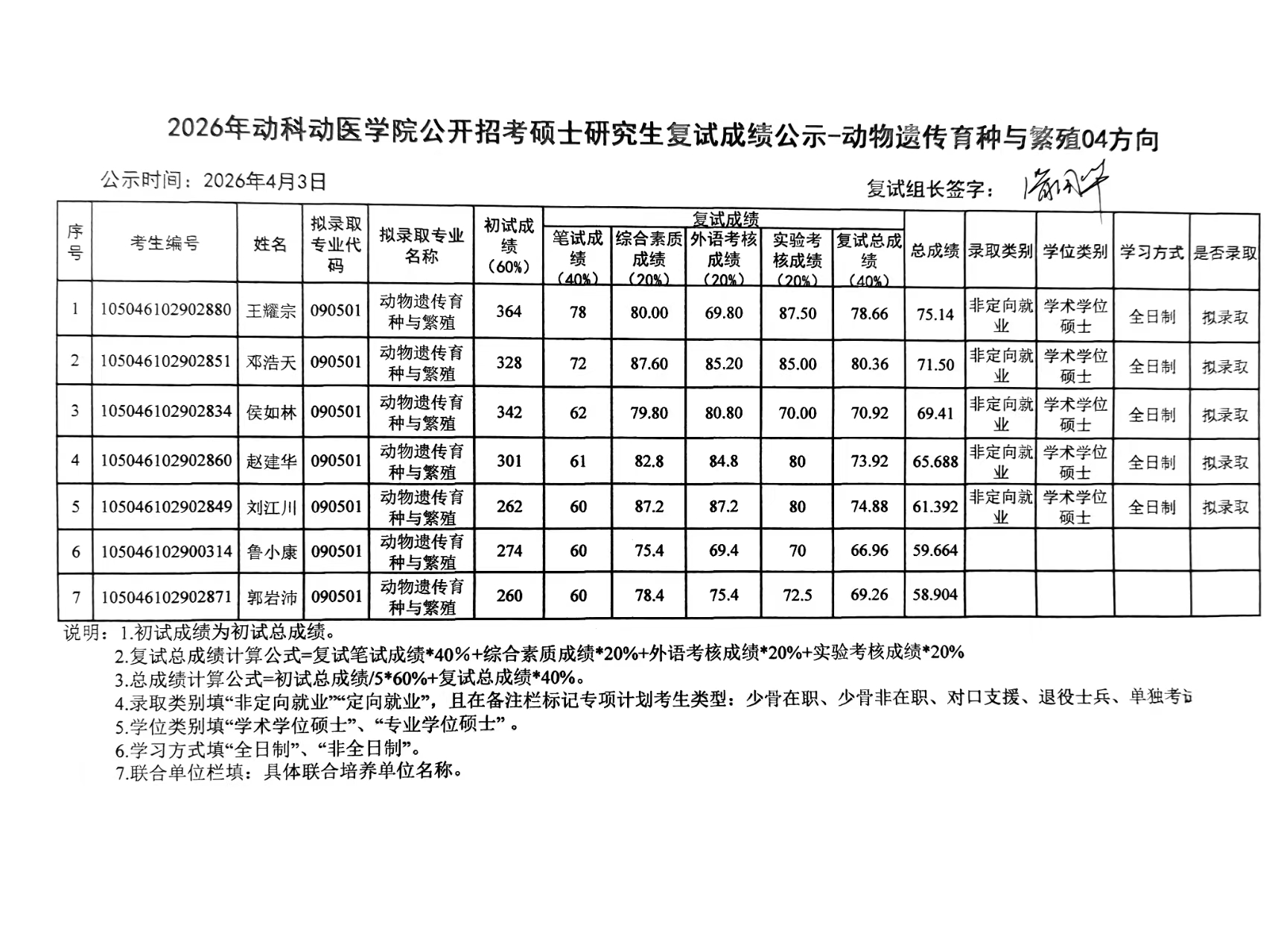 动物遗传育种与繁殖专业04方向复试成绩公示