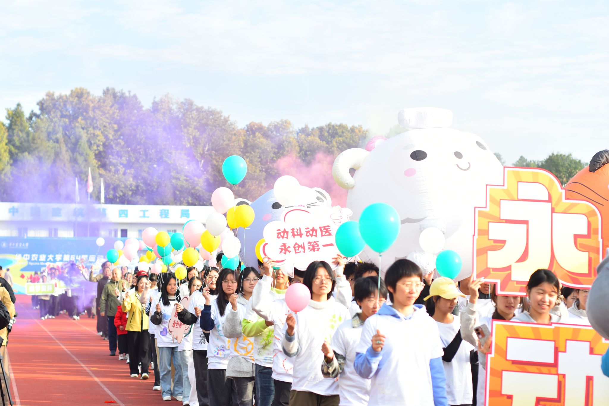 乐声响起,运动员、裁判员代表率先入场,随后各学院及学校各单位代表队伴随讲解词昂首阔步走过主席台。各代表队结合自身特色组成各具特色的方队,创意与活力引发观众席阵阵轰鸣。“动科动医,永创第一”,动科动医学院代表队高举口号牌,步伐铿锵有力,队员们洋溢着幸福笑容,彰显学院团结拼搏、昂扬奋进的精神风貌,誓争再创佳绩。