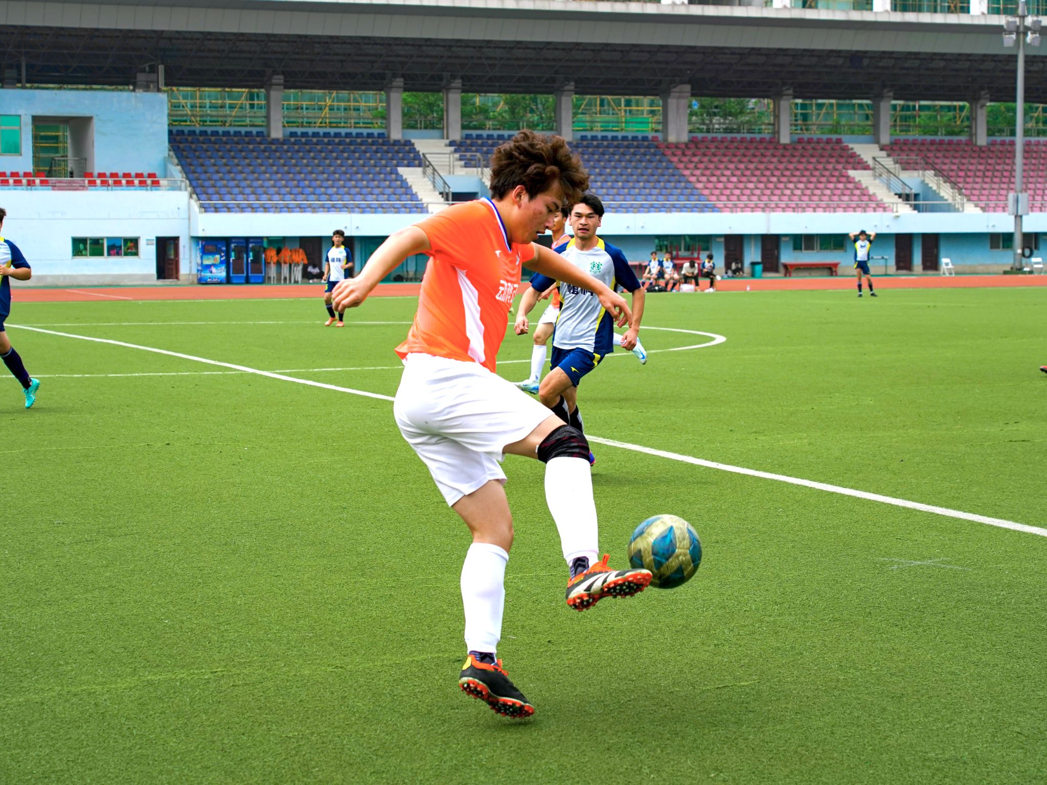 比赛伊始,植科学院队率先发起进攻,8号扎西加措在右侧中场位置果断传球给11号庄子义,庄子义得球后,迅速跟近距离,推射破门。动科动医学院队20号姜纳川虽奋力防守回追但未能阻止进球。失球后,动科动医学院队及时更换策略,多次前压尝试射门。37号王天问在中场拿球后,果断起脚长传,10号方煜博突破防守,起脚射门,成功拿下一分。上半场比赛以1:1结束。